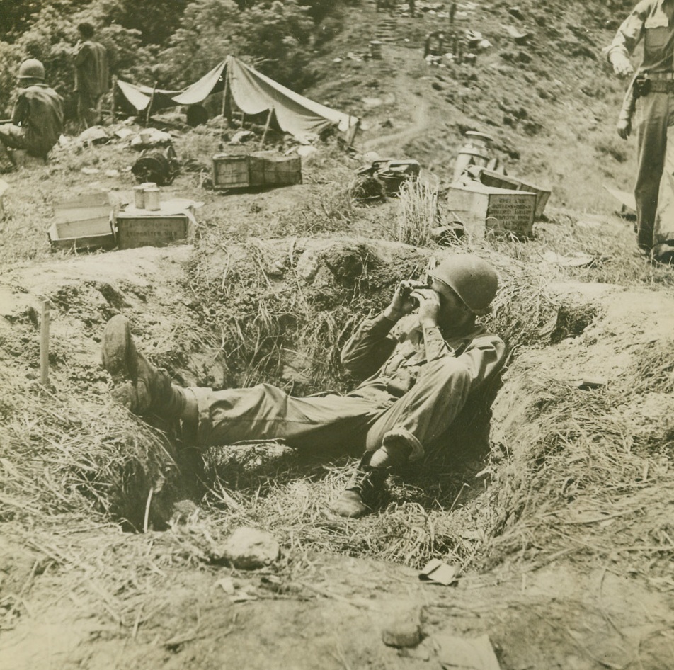 LOOKOUTS, 1/26/1943. GUADALCANAL, S.I.—Lookouts on a hill overlooking Grassy Knoll, 4 miles west of Henderson Field, keep constant watch as the Army launches an offensive on Jap lines, entrenched along the hillside and in the forest below. Latest reports indicate that six important elevations were captured and 110 Japs were killed in the battle. Credit: Acme;
