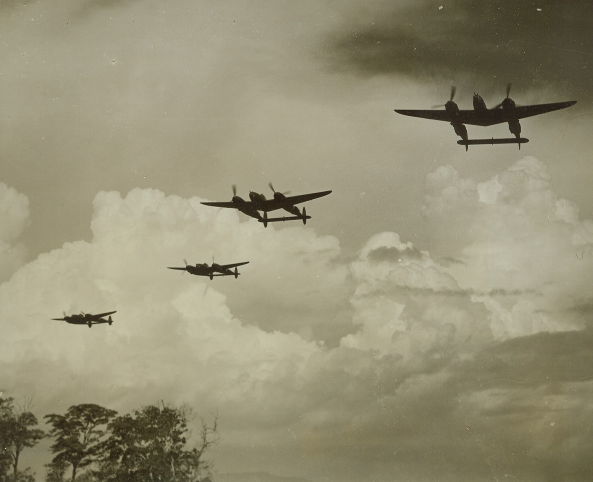 Off to Meet the Japs, 1/10/1943. Port Moresby, New Guinea – A new fighter group with their speedy P-38s is now on the job at Port Moresby. Here four of the planes, of the type which recently knocked out 77 Jap fighters in the convoy battle off Lae, speed out to smash the enemy. (Passed by Army Censor).Credit: ACME;