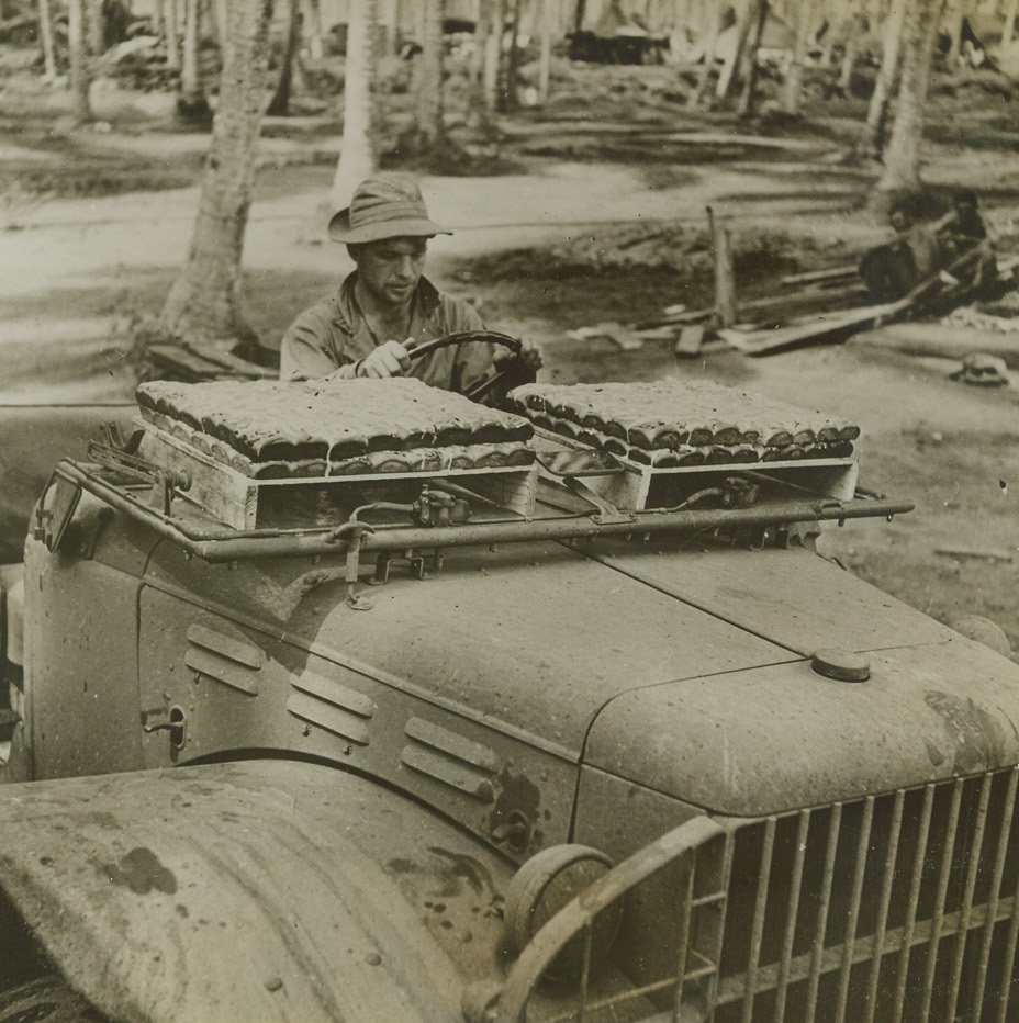 Guadalcanal Baker Boy, 1/29/1943. Guadalcanal – – Sweet rolls stacked on the windshield of this U.S. Army truck, are rushed from the bakery to hungry American fighters on Guadalcanal. Today, U.S. ground forces on the island consolidated their position at Kokumbona, killing 293 more Japs.Credit Line (ACME);