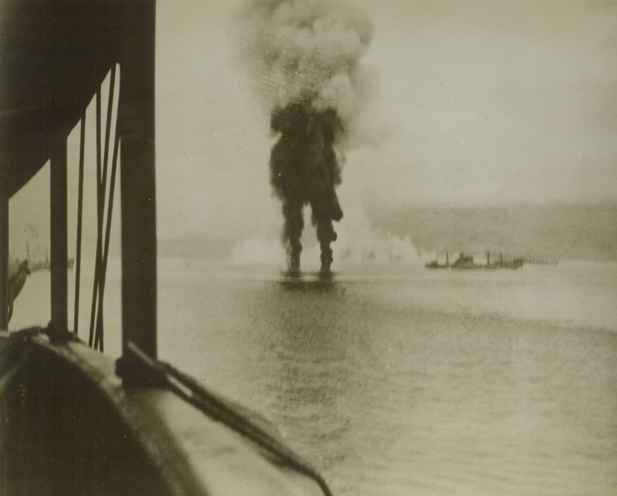 Casualties on Russian-Bound Convoy. 1/16/1943. Somewhere in the North Atlantic—Taken by a U.S. Naval officer from the deck of his ship, these photos show, top: a United States merchant ship at the moment it was struck by an enemy aerial torpedo; and bottom: smoke billowing from an Allied ship after an enemy plane, hit by anti-aircraft fire, crashed into it. The vessel at the right is truning to avoid the explosions from the victim ship. Credit: Official Navy photos from ACME.;