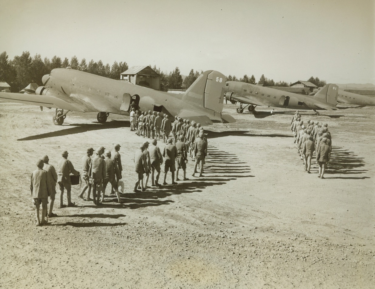 American Transports Fly Chinese Troops, 1/13/1943. Somewhere in China – Chinese troops march to American troop transports, of the India-China ferry command, to be flown to scattered combat fields and training centers. They board the big ships “somewhere in China.” Credit line (ACME);