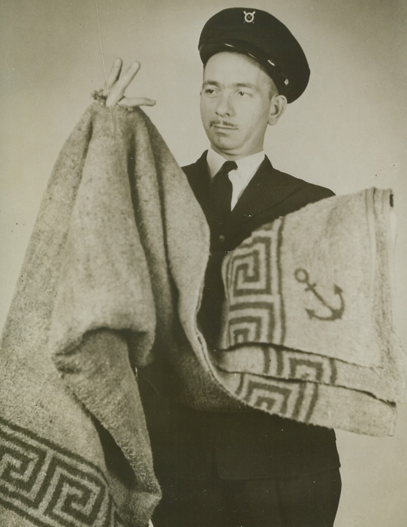 No Title, 1/5/1943. Coast Guardsman James Pox, Uniontown, Pa., waves his fingers through the shell hole ripped by Japanese fire just a few minutes after he left the bunk, the blanket covered. The action occurred in the Solomons. Fox, one of the coast guardsmen who landed the Marines in the original invasion of Guadalcanal, salvaged the blanket from the routed Japs’ effects. Back home on leave, he still has the souvenir of his narrow escape and the Americans still have the island. Credit line (ACME);