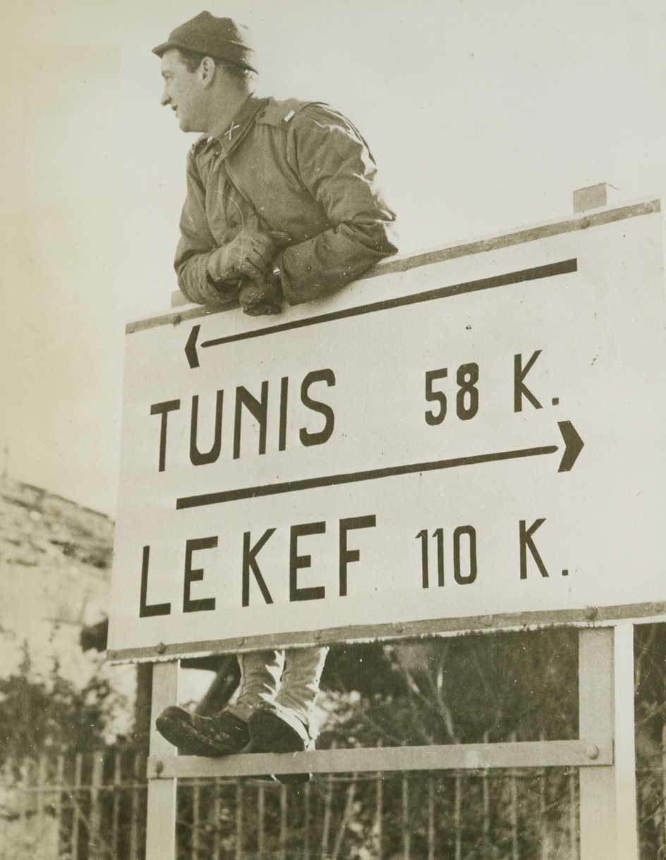 This Way to Tunis, 1/6/1943. Tunisia – This American soldier knows where he’s going – but he’s taking time out to get his wind before heading for Tunis, only 58 kilometers away. Latest reports from that area indicate that the allies are closer to the key city than that. A lightening British Commando-led attack is reported to have wrested the heights of Jebel Azzeg from the Nazis. Credit line is not visible.;