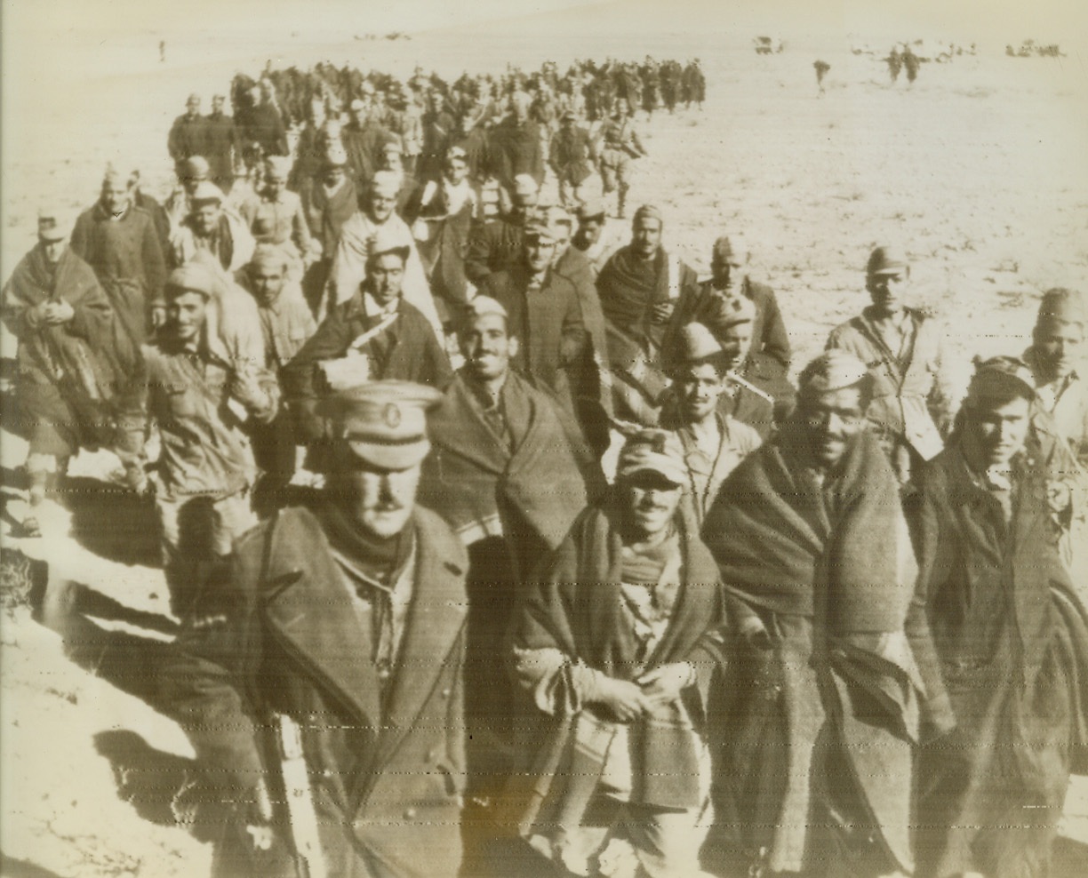 Nazi Prisoners Near Tripoli, 1/25/1943. North Africa—Italians and Germans who were captured near Tripoli are shown being marched back to a waiting transport. Note that the prisoners have been carefully separated, with the Italians in front and the Germans behind. Photo radioed from Cairo at noon today.Credit: ACME radiophoto.;
