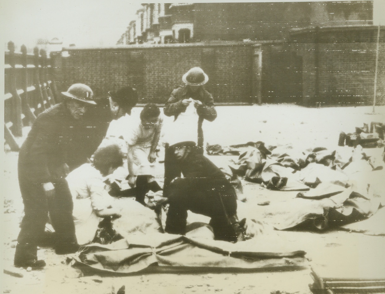 Girls Clear London Bomber Debris, 1/18/1943. LONDON – London girls sweep up shattered glass and the slight debris outside of a department store which was damaged during the feeble Nazi aerial atteck on January 17. The Nazis scarcely damaged the British Capital in their weak retaliation for the devastating RAF raids on Berlin.; Photo cabled from London to New York today.; Full DJH; Credit (ACME cablephoto); 1/18/43;