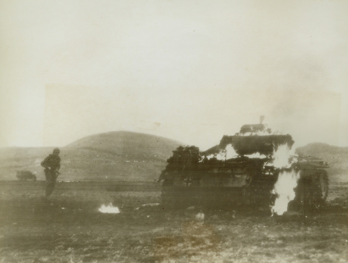 Nazi Tank Comes to “Timely” End, 1/12/1943.Tunisia—An American tommy-gunner runs toward a burning German tank, ready to capture any Nazis who might escape the fiery death, after a duel with Allied anti-tank units near Med Jez El Bab. Latest reports indicate the Axis has set up machine gun nests at all available strong points and have honeycombed all vantage points between Med Jez El Bab and Tunis, which the Allies will have to blast out. Photo flashed from London to New York by radio today (Jan. 12).Credit: ACME radiophoto;