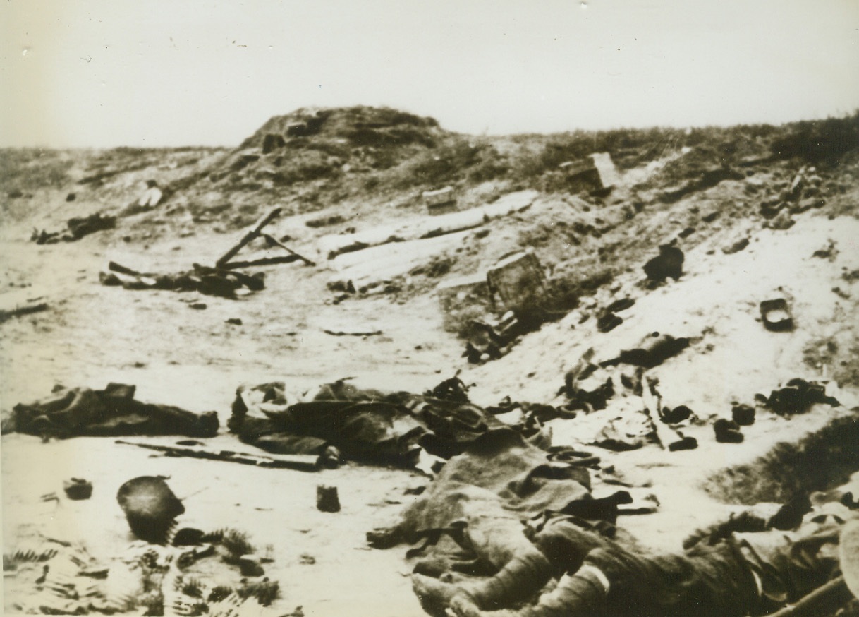 Dead Nazis in Stalingrad, 1/17/1943. Stalingrad, U.S.S.R.—Strewn on the battlefield southwest of Stalingrad, these dead Nazis once manned part of the enemy’s heavily fortified lines. They were left here by their comrades after the Red Army broke through their lines. Latest reports from the Russian front indicate that the Red Army has captured the important German base and railroad junction of Millerovo, 125 miles north of Rostov, almost annihilating a Nazi garrison. Passed by censor. Credit: ACME.;