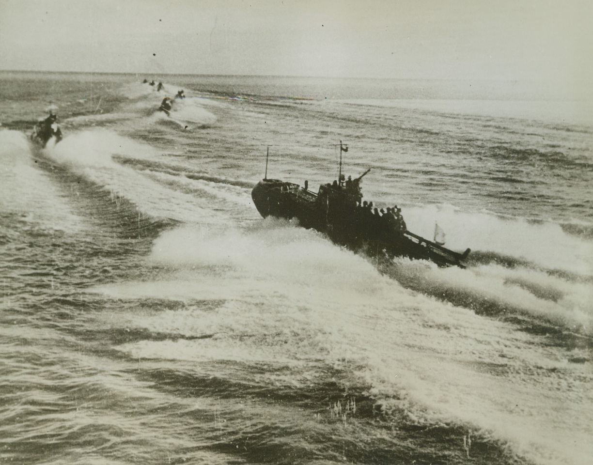 Ready For The Jungles Of Bougainville, 1/23/1943. South Pacific — Crouching low in their landing craft, U.S. Marines approach Empress Augusta Bay, Bougainville Island, in the South Pacific. They are ready with camouflage suits for the jungle fighting that followed the rushing of the beaches. 1/23/43 (ACME);