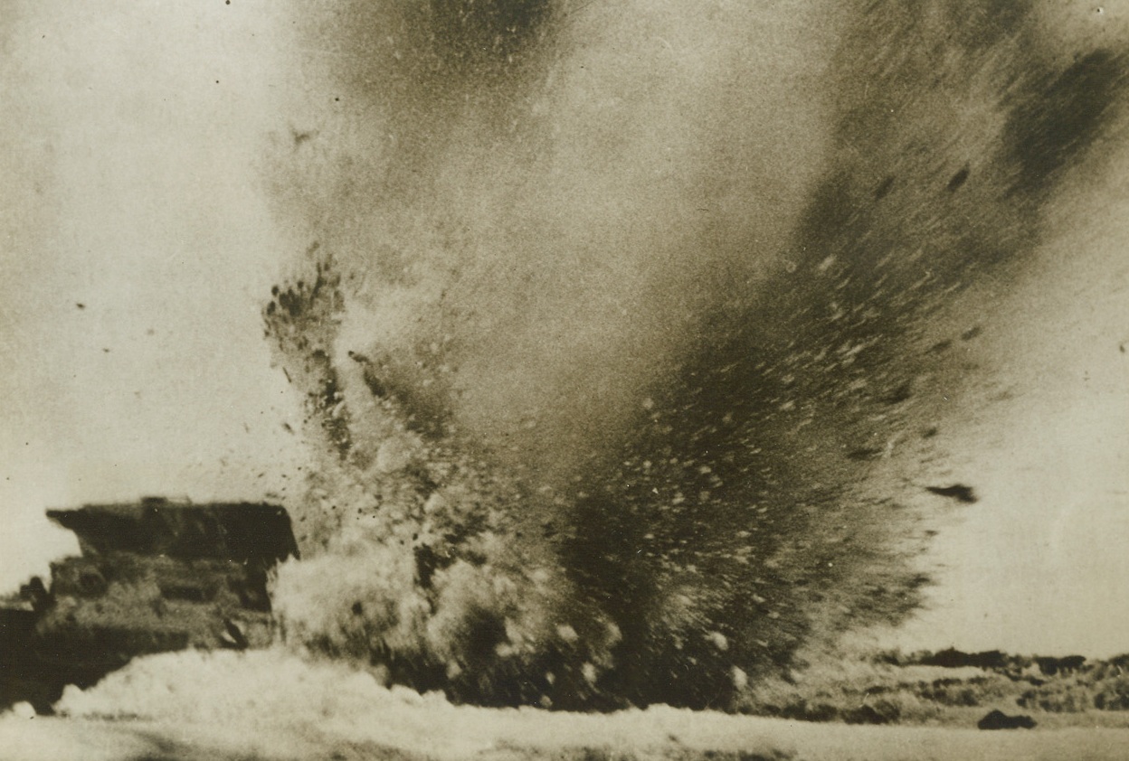 Big Boom, 1/6/1943. Voronezh, U.S.S.R.—A Nazi tank touches off a mine laid by the Russians during a German counter-attack in advanced Russian troops in the Voronezh area and—BOOM! Photo was made as the tank scattered in a million pieces on the battlefield. Latest reports from the Soviet front indicate that the Axis is in disorderly retreat from the north Caucasus area and that the Red Army has bagged 26,500 more Nazis. Passed by censor. Credit: ACME.;