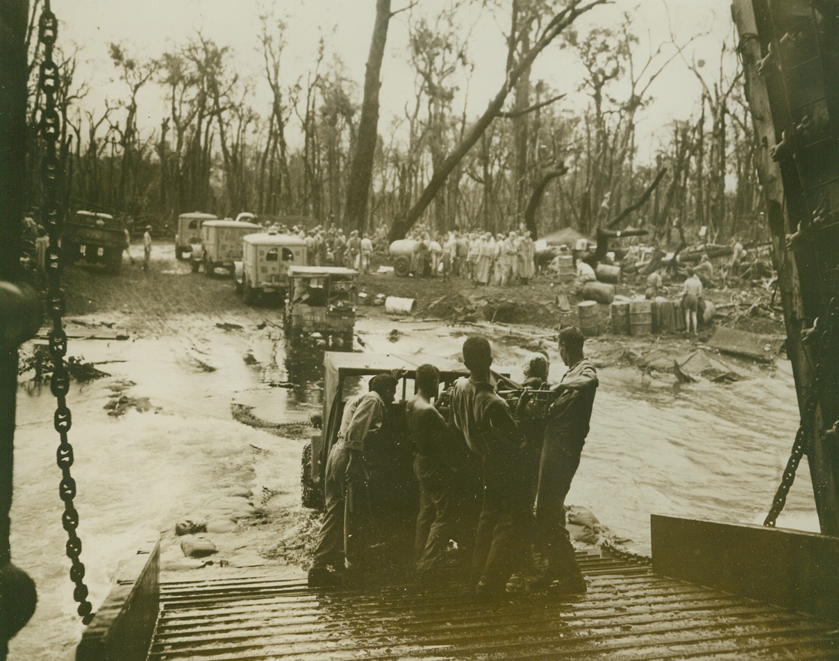 Heave – Ho, 1/6/1944. Saidor, New Guinea — Fresh off an LST, this jeep makes a bumpy trip up the beach at Saidor, New Guinea. Just landed, a group of American soldiers escorts the tiny car over the rough path to newly-laid road mats.Credit (Signal Corps radio telephoto from ACME
