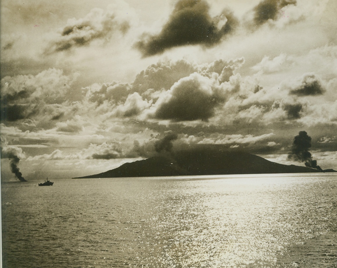 Jap Warbirds Crash at the Cape, 1/8/1944. Cape Gloucester, New Britain – Only thin columns of black smoke remain of three Jap planes that attempted to attack Coast Guard and Navy-manned LSTs invading Cape Gloucester. The pyres burn at extreme left, center, and extreme right of photo, marking the spots where the ill-fated attackers plunged into the sea.Credit Line (U.S. Coast Guard photo from ACME);
