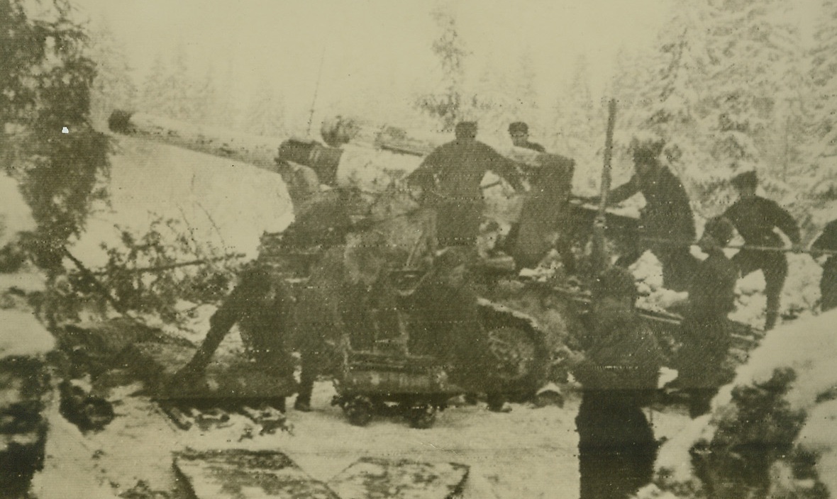 Shelling Nazis, 1/17/1944. ON THE RUSSIAN FRONT—Shelling enemy communication lines, a heavy Soviet gun makes things hot for the Nazis in the Vitebsk area, as the Russians fight in a snowbound forest. Photo radioed to New York today (January 17th) from Moscow.Credit: ACME Radiophoto;