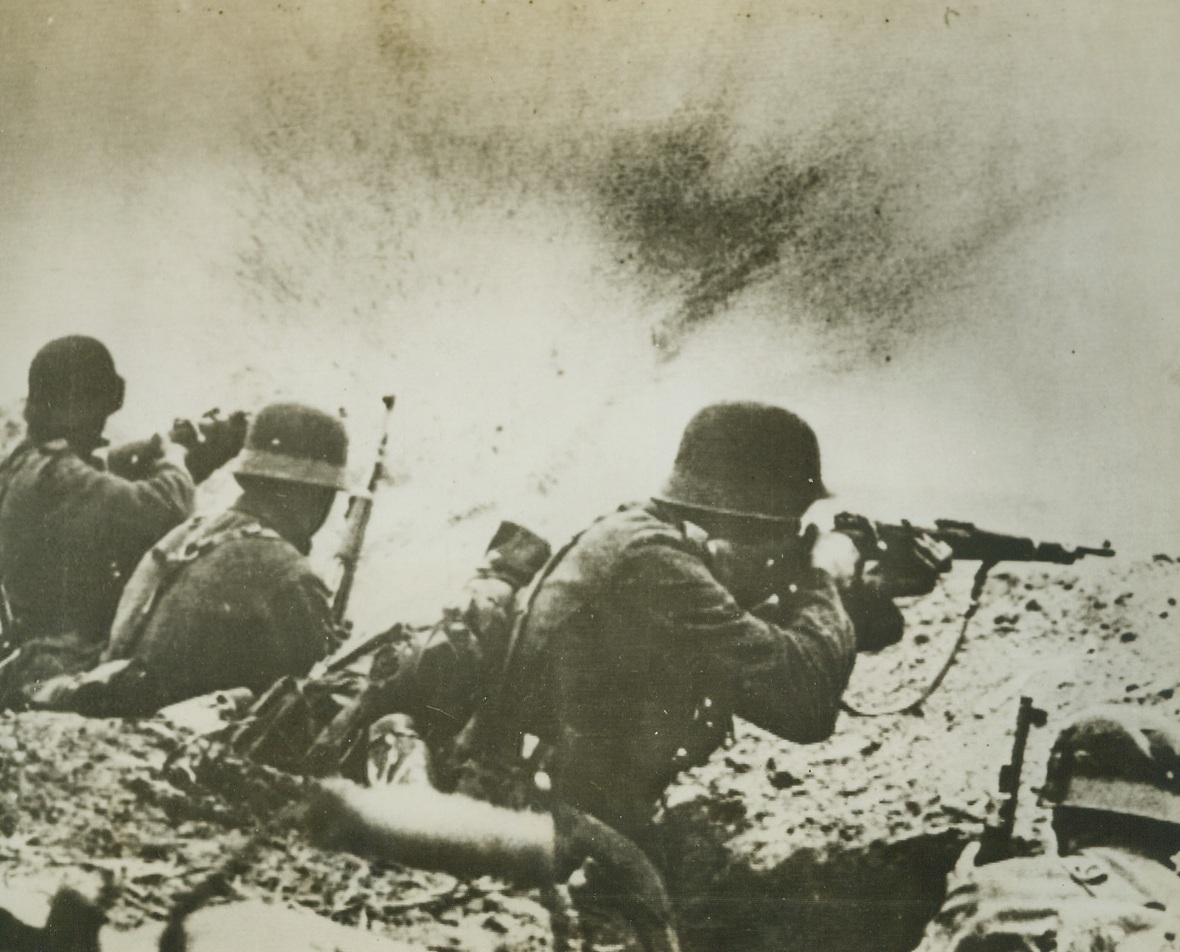 A “Hot One” for Fritz, 1/20/1944. A Russian shell bursts on the parapet of a German trench “somewhere in the South Russian front,” in this photo just received from a neutral source. Nazi soldier, in foreground, ducks the shower of dirt and shell fragments, while his comrades keep firing their rifles. Today it was announced that the key city of Novgorod in North Russia has been captured from the Germans, while the Soviet advance in the south continues. Passed by censors.Credit: ACME;