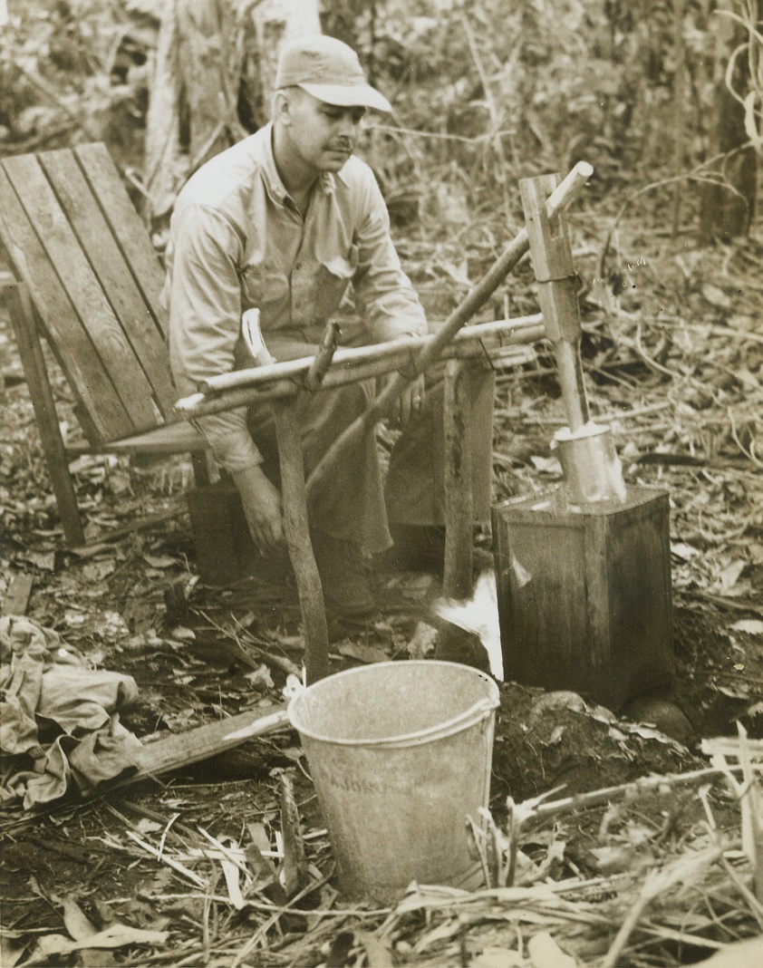 Wash Day in New Britain, 1/31/1944. New Britain – Major H.R. Kolp, USMC, of Akron, Ohio, does his washing in a homemade “washing machine”, made of a 10 gallon fruit can placed over a fire built in a pit. An agitating plunger—a can at the end of a piece of wood—the clothes. Credit line (ACME photo by Thomas L. Shafer for the War Picture Pool;