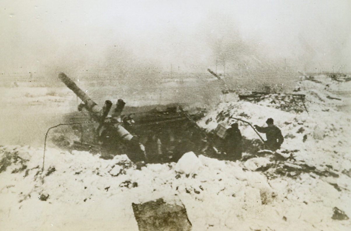 Soviets Rip Nazi Defenses at Leningrad, 1/22/1944. Russia—Heavy Russian guns blast Nazi fortifications near Leningrad, tearing holes in the mighty fortress built during the two-and-a-half year Nazi possession of the Soviet second city. The Russian caption says that “tens of thousands” of Germans have been killed in this area, where the capture of key rail junctions cuts off the escape of thousands more. Credit: ACME radiophoto.