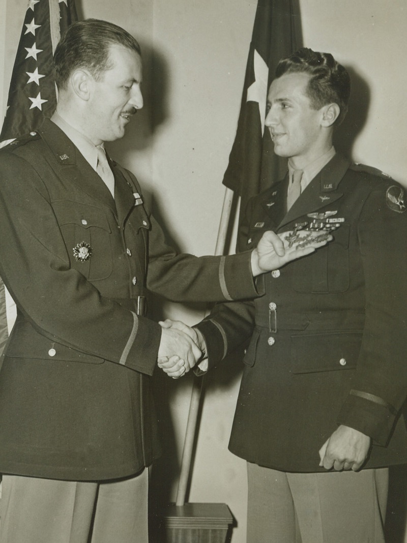 AWARDED THREE MEDALS FOR 100-DAY TREK, 1/18/1944. WASHINGTON, D.C.—A 100-day trek through an enemy-held jungle, after he was shot down by a Jap plane over Rabaul, brought three decorations for Major Arthur L. Post (left) of Milwaukee, Wisc. Bringing back valuable information when he finally reached Yank headquarters, Major Post was cited by Lt. Gen. Kenney and awarded the Distinguished Service Cross, the Flying Cross, and the Air Medal. Here, Brig. Gen. L.S. Kuter, acting Chief of the Air Staff, congratulates the flying hero. Credit Line (ACME);
