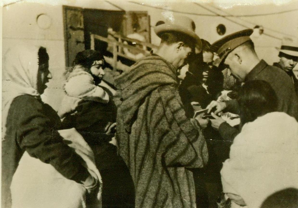 A new change for homeless refugees, 1/10/1944. A NORTH AFRICAN PORT – Some of a large group of refugees, left homeless by the German advance through Europe, check out at a North African port before boarding a ship, which will take them to Palestine. There, they will be given the opportunity to establish themselves as agricultural settlers. CREDIT LINE (ACME) 1-10-44;