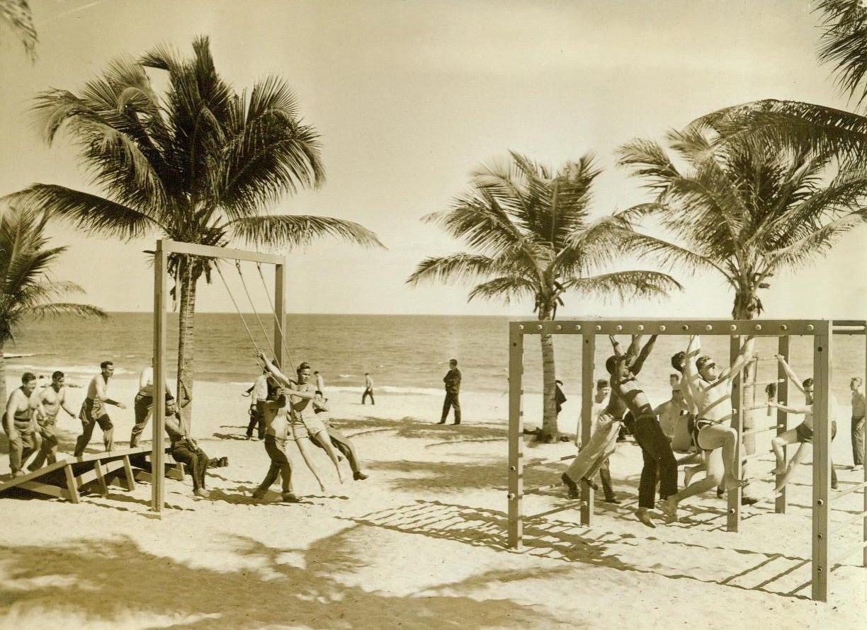Getting Back Strength Under Florida Sun, 1/3/1944. Palm Beach, Fla—A bunch of husky, or near-husky soldiers doing their calisthenics is a strange sight in the patio of the exclusive Breakers Hotel, in Palm Beach. Now the Ream General Hospital, the former luxurious winter home of wealthy vacationists houses soldiers just returning from war theaters and those injured in U.S. camps. The wounded fighters may have to find a new place to relax and grow healthy if the onetime hotel is returned to its owners. Credit: ACME.