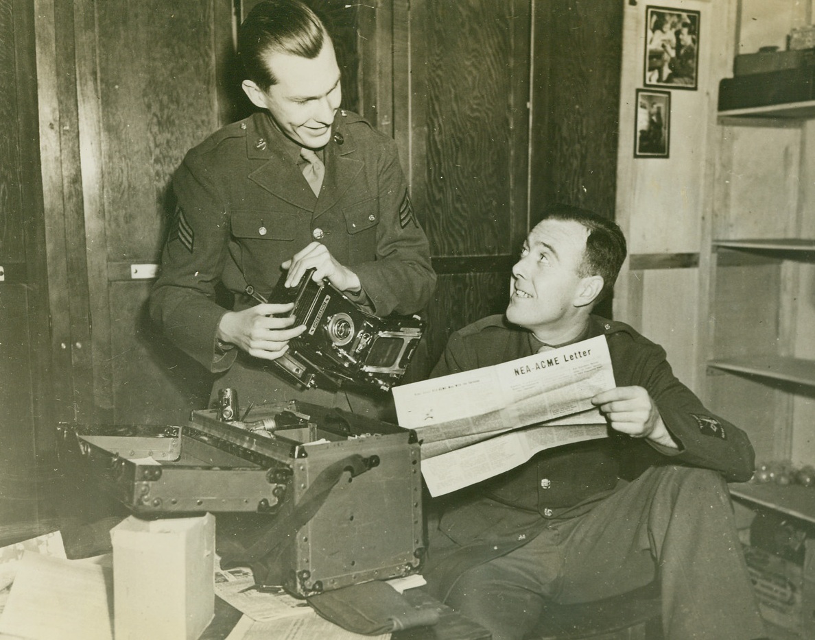 Hello Again, 1/7/1944. Somewhere in England – Meeting in England, a year and a half after both boys worked on ACME Newspictures’ photographic staff, Sgt. Reginald Kenny (left) of Somerville, New Jersey, and Sgt. Bruce Bacon, of Rockville Centre, Long Island, New York, catch up on their news of the boys back at the home office. Sgt. Bacon, who reads the NEA-ACME letter, is with the Army Pictorial Service. Sgt. Kenny is with the U.S. Army Public Relations Office. Credit: ACME;