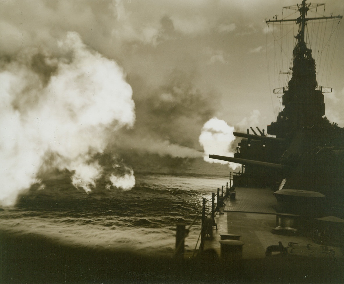 SHAKEDOWN CRUISE, 1/26/1944. AT SEA—A vital part of the training of men who fight at sea is the shakedown cruise, the run on which embryo sailors try their sea legs, get acquainted with their shipmates, and learn how to operate their ship. Here, six-inch guns blast forth in a cloud of smoke and flame, manned by Navy fighters making their shakedown cruise.Credit: Official U.S. Navy photo from Acme