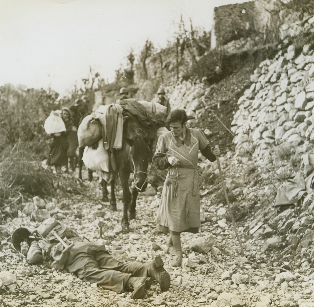 Return of the Natives, 1/1/1944. LAGONE, ITALY—Coming down from the hills in which they hid while war raged about their homes, these natives find a dead Nazi soldier in their path. Leading a mule laden with her belongings, her face distorted with hatred, an Italian woman carefully avoids fallen Nazi. Credit: WP (ACME photo by Bert Brandt, War Pool Correspondent)