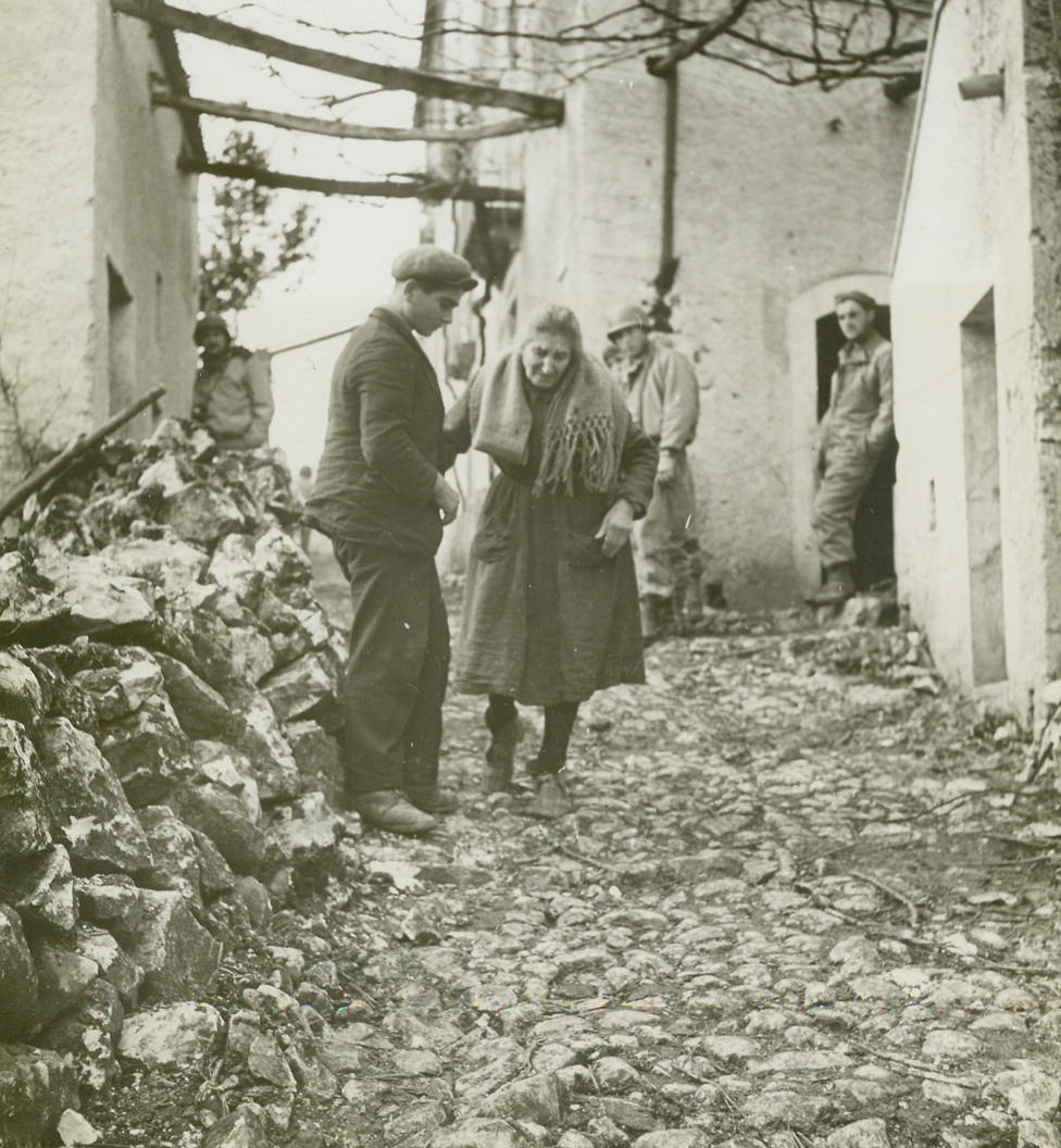 Return of the Natives, 1/1/1944. LAGONE, ITALY—An Italian boy helps his feeble grandmother along the rocky, rubble-strewn street that leads to their bomb-wrecked home, which was completely destroyed by the retreating Nazi forces. Credit: ACME photo by Bert Brandt, war picture pool correspondent.