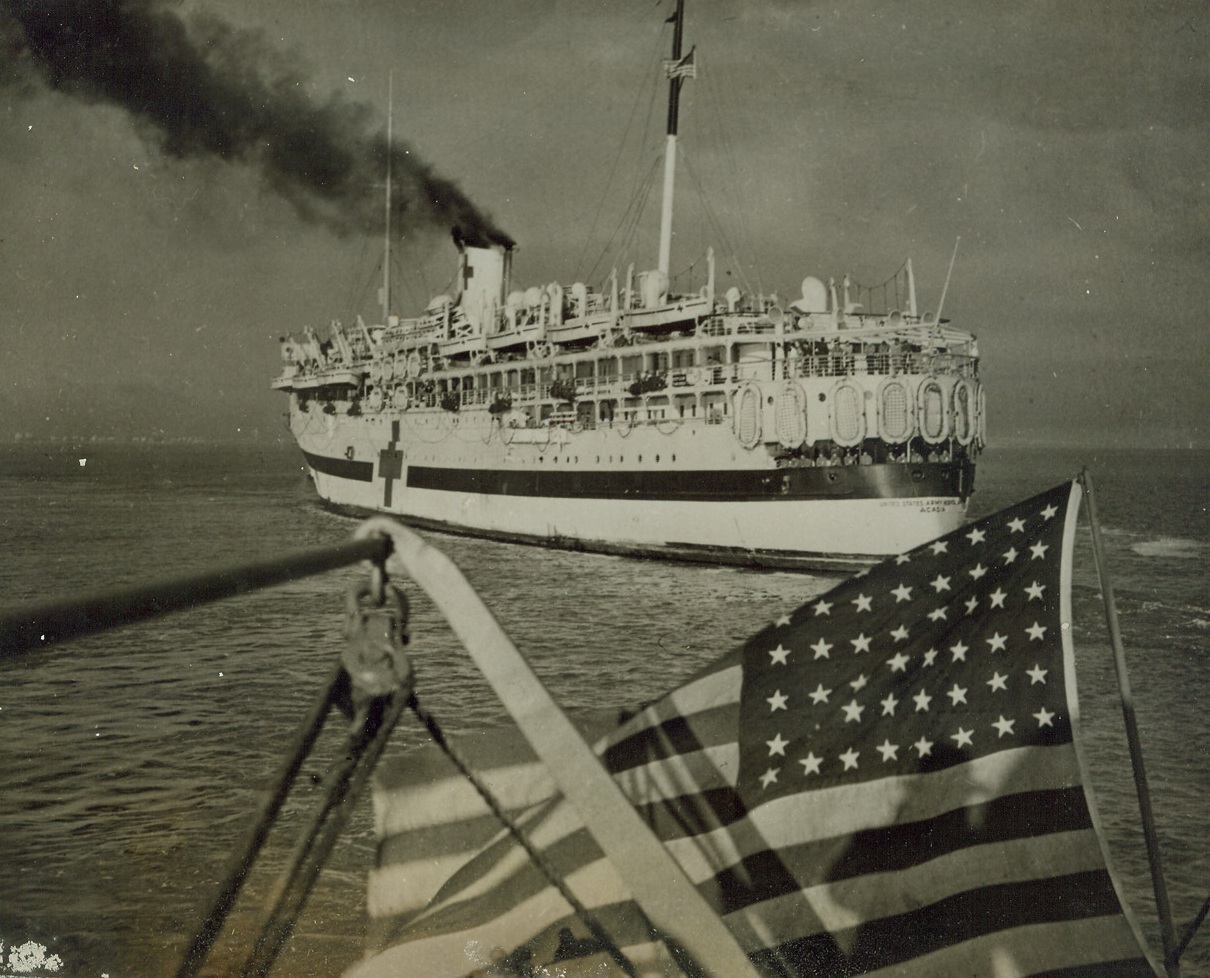 She Brought Happy Warriors Home, 1/8/1944. AT AN EAST COAST PORT — Steaming into an East coast port with her precious cargo on January 5th, the U.S. Army hospital ship Acadia brings a batch of wounded, but happy Yanks back to their homeland. The vessel carried casualties from North Africa, Italy and Europe, who were sent to Hospitals for treatment as soon as they debarked. Credit: ACME.