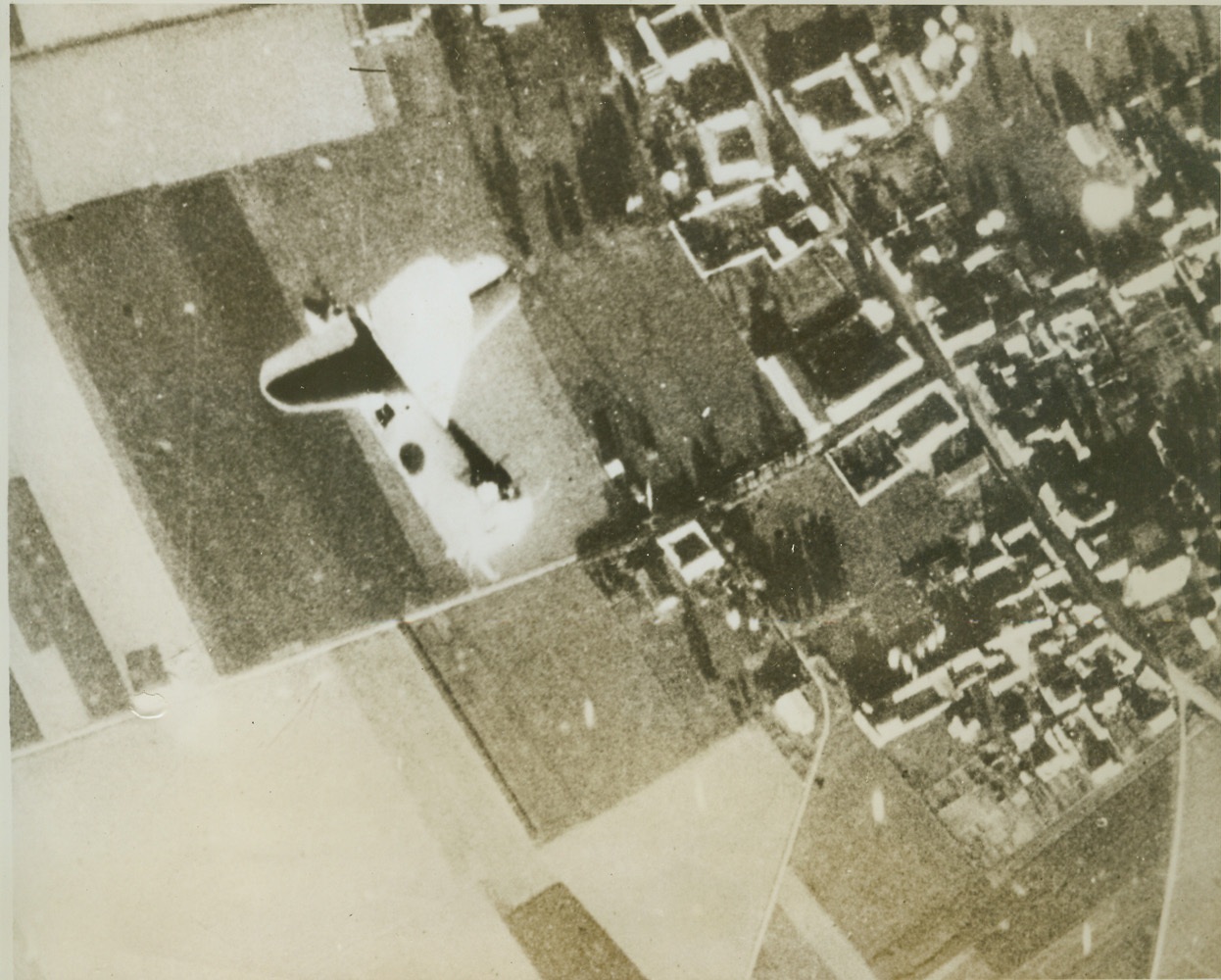 Just Ignored, 1/31/1944. England – Liberator bombers of the U.S. Army 8th Air Force wing their way to their target, Munster, Germany, and contemptuous of Nazi aerial strength, blandly ignore this German airfield enroute to their mission. Credit: U.S. Army Air Forces photo from ACME;