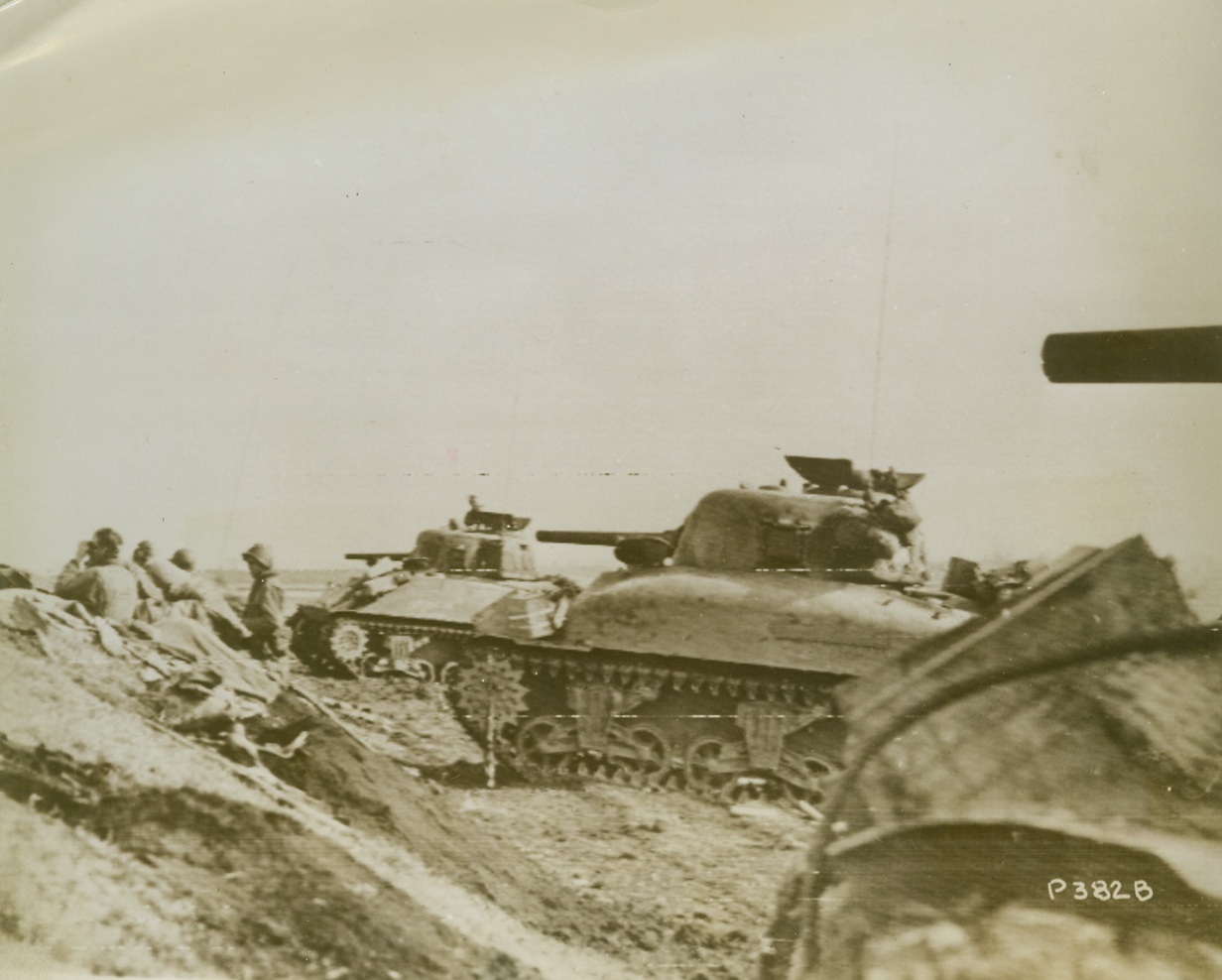 Keeping Track of the Nazis, 1/29/1944. NETTUNO, ITALY – Before advancing, Fifth Army tankmen leave their armored vehicles to scan the plains near Nettuno, Italy, for any signs of the enemy who were completely surprised by the Allied amphibious landings south of Rome. They park their war machines in a ravine in the Mussolini Canal sector of the new front.Credit (Acme Photo by Bert Brandt, via Signal Corps Radiotelephoto;