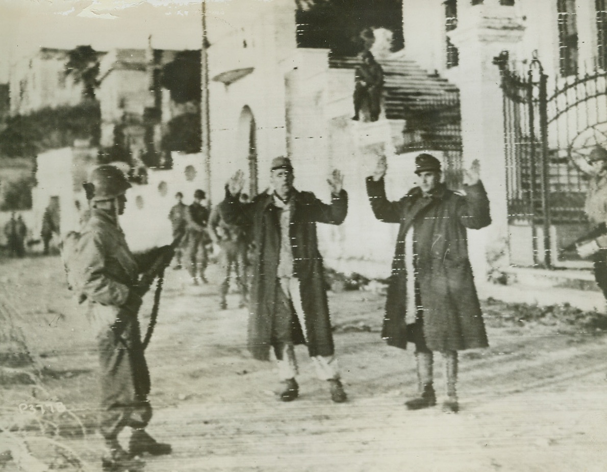NAZIS SURRENDER, 1/27/1944. NETTUONO, ITALY—Holding their hands high, a pair of Nazis surrender to Fifth Army men in Nettuono. Our fighters reached the town shortly after making their surprise landing at Anzio, Italy. Credit: U.S. Signal Corps radiotelephoto from Acme;