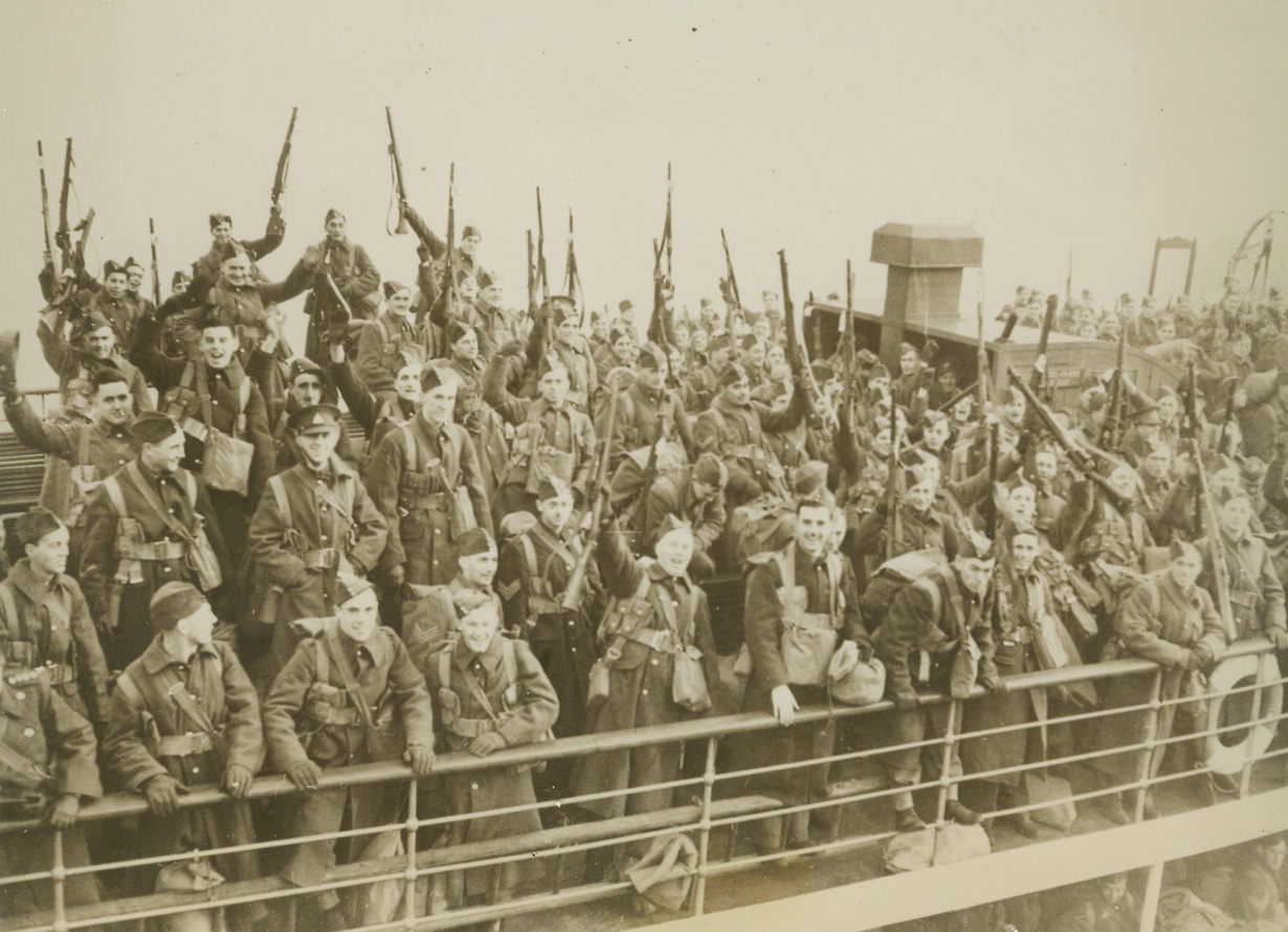 FIRST CANADIAN TROOPS ARRIVE IN ENGLAND, 1/3/1940 SOMEWHERE IN ENGLAND—Canadian troops, among the first Dominion Division to reach England for training to fit them for duty on the British front in France, raise a cheer alongside the quay as they arrived at an unidentified British port. Credit Line (ACME);