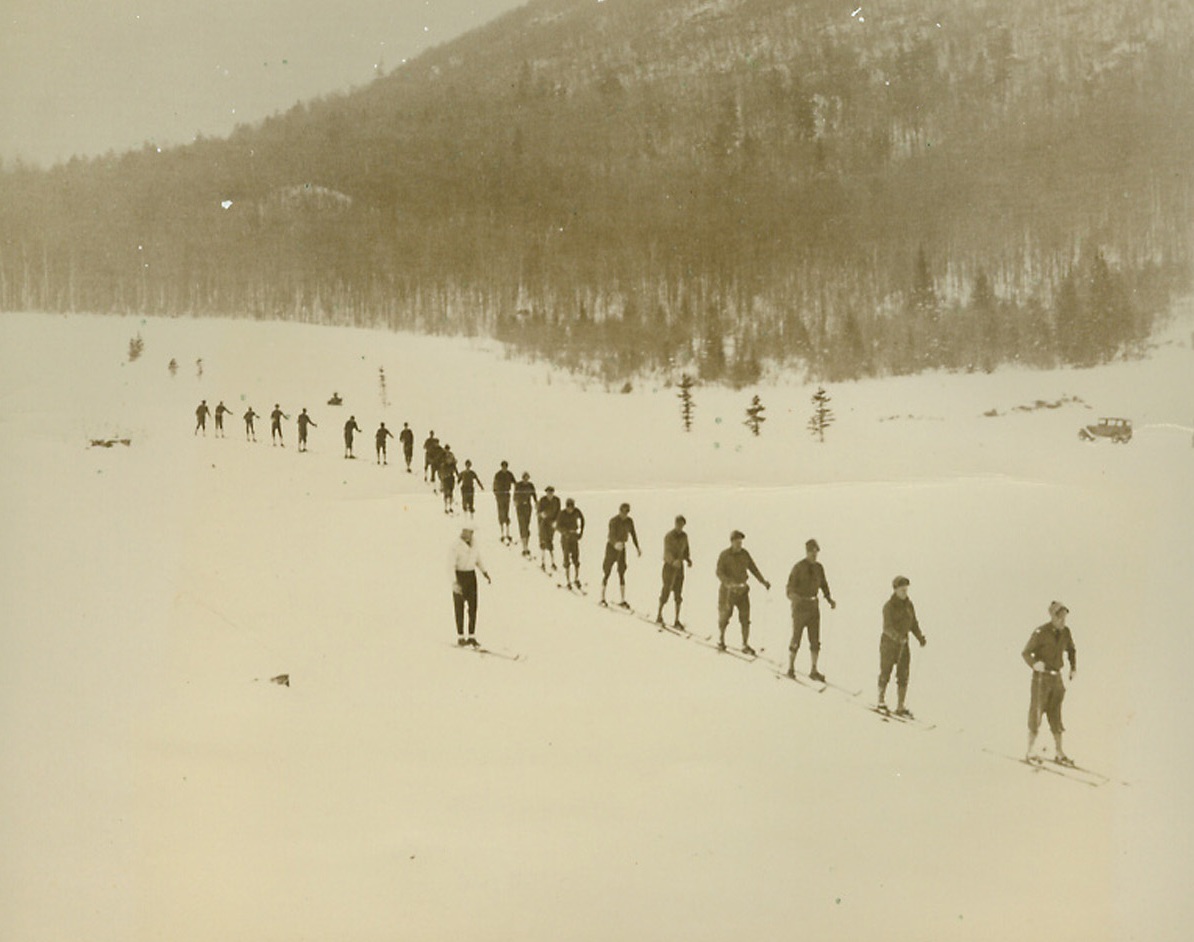 U.S. Army Takes to Skis, 1/14/1940 Lake Placid, N.Y.—Perhaps taking a lesson from the Fighting Finns who glide swiftly over the snow to cut down unwary Russians. Men of the 26th Infantry, U.S. Army, stationed at Plattsburg, N.Y., slide along in single file as they receive ski instruction at Lake Placid from Rolf Munsen, Olympic star. Credit: ACME;