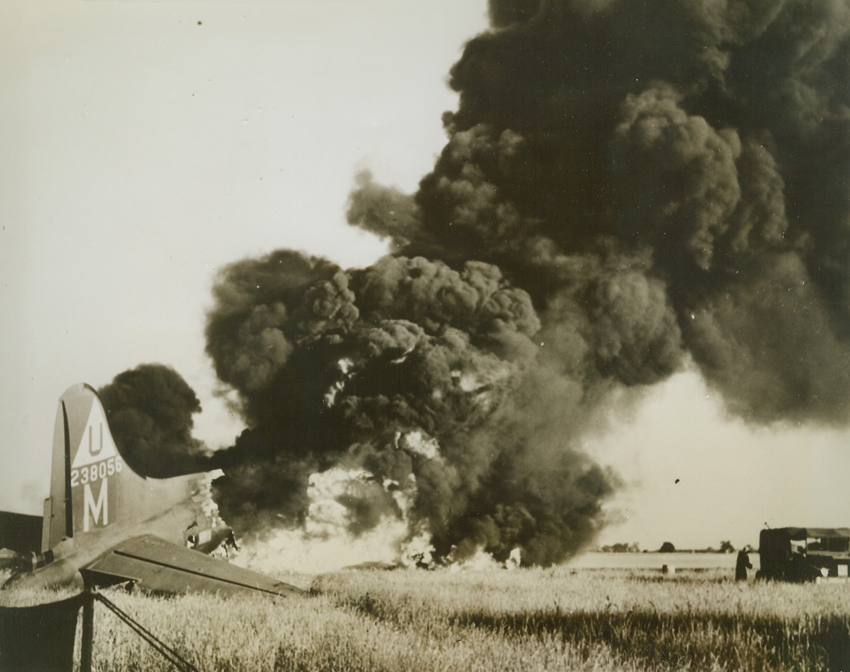 Crew Saved from Burning Liberator, 7/20/1944. ITALY—When this 15th Air Force B-24 Liberator bomber crashed at a field in Southern Italy, ground crew men rushed in and pulled the plane’s crew to safety. No one was killed as a result of the crash. A short while afterward, the aircraft’s gas tanks exploded ravaging the ship. Emergency crews could do nothing to save the Liberator and worked hard keeping the flames from spreading. Credit: USAAF Photo from ACME.;
