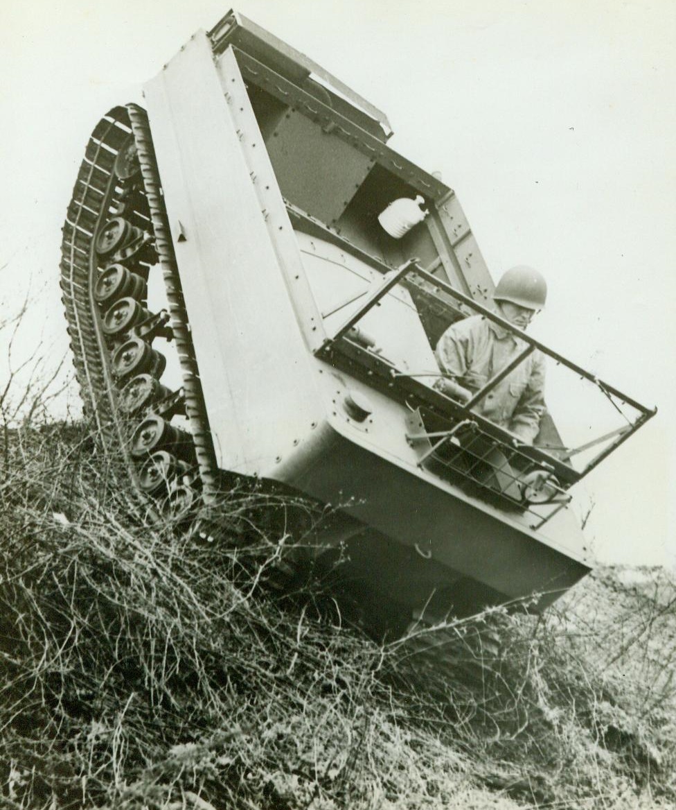 Weasel Joins the Army Parade, 7/3/1944. SOUTH BEND, IND. – In secret production for two years at the Studebaker Automobile Factory in South Bend, Ind., a radical war vehicle is shown for the first time by the Army. Known as the “Weasel” (official name is M-29) it is a low-slung, square-faced personnel and supply carrier, capable of operating over snow, deep mud, sand or on paved highways, a greater variety of terrain conditions than possible in any other previous vehicle. The Weasel’s light weight combined with broad rubber-padded tracks allow for high speeds on any ground condition. Pressure on the ground exerted by the Weasel is about One-Fourth that of a fully equipped infantryman. The Weasel, minus its camoflage and canvas curtain top for summer use, negotiates a steep grade with ease.;