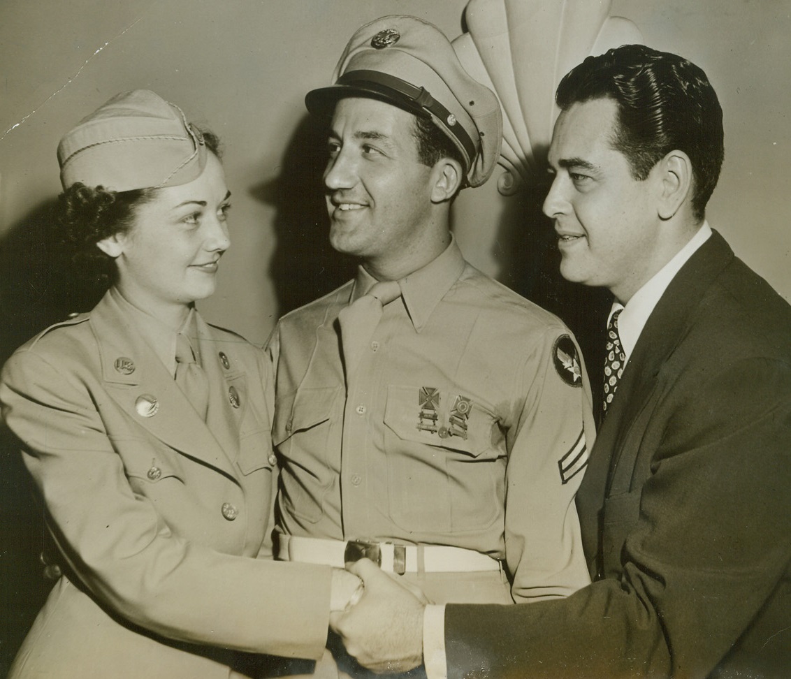 ATC’S COVER GIRL, 7/15/1944. NEW YORK—Pvt. Lucille Berman (left), of the Ferrying Division, Love Field, Dallas, Tex., has been acclaimed Typical WAC by the Air Transport Command. The contest was judged solely by Harry Conover (right) who chose the winner from letters written by various soldiers describing the virtues of their candidate. Cpl. Bernie Berman, Jacksonville, Fla., who wrote the winning letter, married Pvt. Berman three days after she was announced the winner. Pvt. Berman was given official tribute at the Conover Model Agency today (July 15). Credit (ACME);