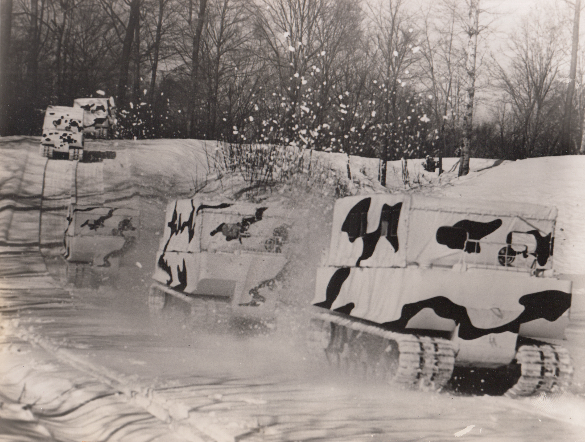 Weasel Joins the Army Parade, 7/3/1944. South Bend, Indiana — In secret production for two years at the Studebaker automobile factory in South Bend, Indiana, a radical war vehicle is shown for the first time by the army. Known as the “Weasel” (official name is M-29), it is a low-slung, square-faced personnel and supply carrier, capable of operating over snow, deep mud, sand or on paved highways, a greater variety of terrain conditions than possible in any other previous vehicle. The Weasel’s light weight combined with broad rubber-padded tracks allows for high speeds on any ground condition. Pressure on the ground exerted by the Weasel is about one-fourth that of a fully-equipped infantryman. In winter, over snow-packed ground and camouflaged in weird black and white pattern, the Weasel fairly skims along the surface likes its animal namesake.;