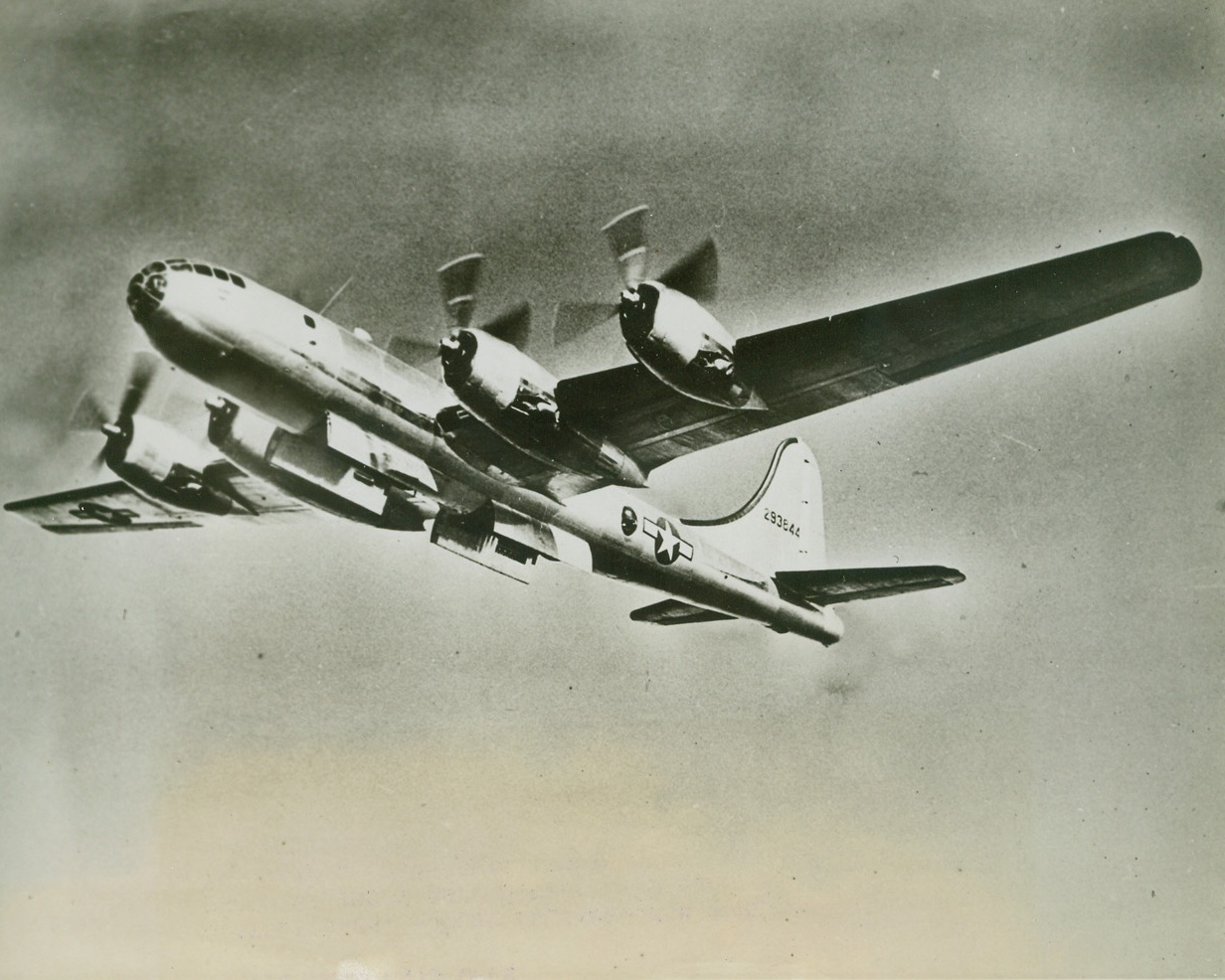 Double Bomb Bays Open, 7/26/1944. SEATTLE, WASH – just released for publication is this photo of the mighty Boeing B-29 Superfortress with it’s two sets of bomb bays’ doors open, ready to pour forth a deadly cargo. To keep the plane’s center of gravity undisturbed, bombs drop from the bays alternately.Credit: ACME;
