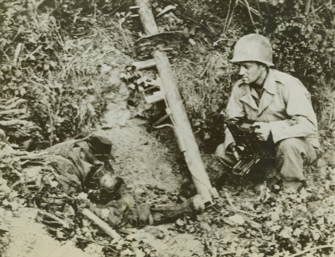 Title Covered, 7/29/1944. FRANCE—Sprawled by his weapon, a Nazi bazooka gunner lies dead, a victim of the terrific allied aerial and artillery attack in the Marigny area of France. A U.S. Signal Corps photographer, camera in hand, looks over the gunner and the weapon which will no longer toss shells at American tanks. Credit (Signal Corps Radiotelephoto from ACME);