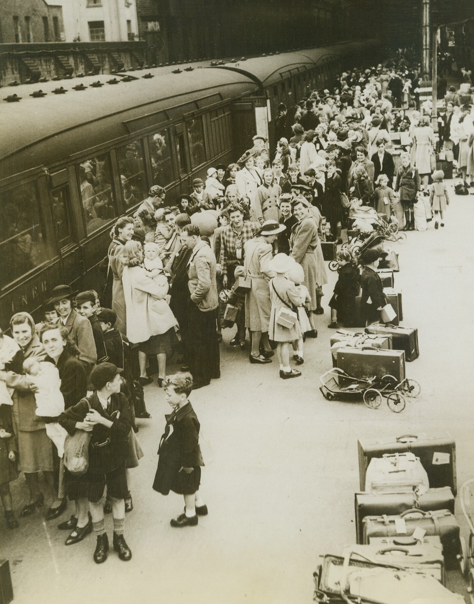 Children Evacuated from London, 7/14/1944. London, Eng.—A policewoman reassures these children who are being evacuated from London to a zone which is safe from the Nazi flying bombs which have been hitting at southern England. Tagged for identification, these youngsters embark upon their new adventure with smiles, even though most of them are leaving their parents behind in London. Credit: ACME;