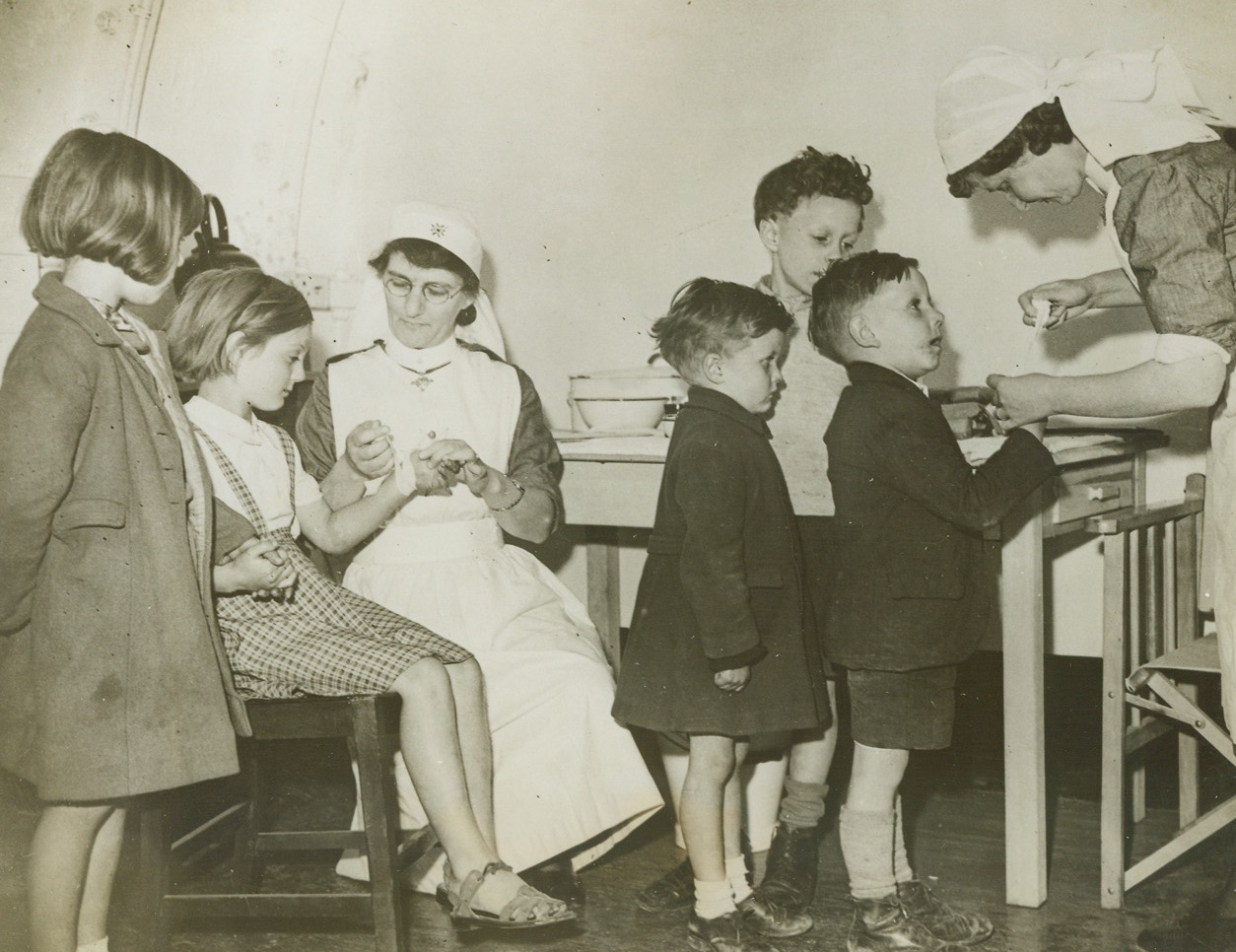 New Deep Shelter Against “Buzz-Bombs”, 7/27/1944. LONDON, ENG—To allow Londoners protection and to give them some opportunity to sleep while the city is under bombardment by German Robot “Buzz Bombs,” the first of a series of deep shelters has been opened. These new shelters consist of two main twin tunnels running beneath existing tube railway (subway) lines. They are divided into 6 sections each fitted with bunks for 500 persons. Cross-passages connecting the two tubes contain first aid posts, lavatories and machinery control rooms. Bunks fold against the walls when not in use to allow free passage of traffic. Four canteens are provided at suitable points, run by volunteer organizations. The shelters are controlled and administered by commissioners for the London civil defense region. Each shelter is in charge of a shelter superintendent, with a nucleus staff of fulltime wardens supplemented by volunteer wardens. New York Bureau At a First Aid station, nurses take care of minor casualties. Credit Line (ACME);