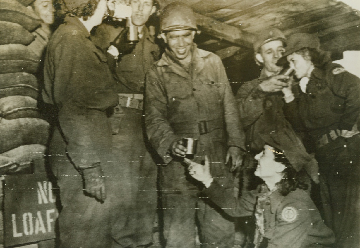 Red Cross Turn About, 7/19/1944. France – Turn about’s fair play so the Army reversed the tables and served coffee in “C” ration cans to Red Cross girls just arrived in France with their Clubmobile. The young ladies receiving hot java are (left to right): Nellie Borland, Scranton, Kas.; Marjorie Lee, Cedartown, Ga.; and Irma Lappay, Detroit, Mich. Credit: US Army Radiotelephoto From ACME;
