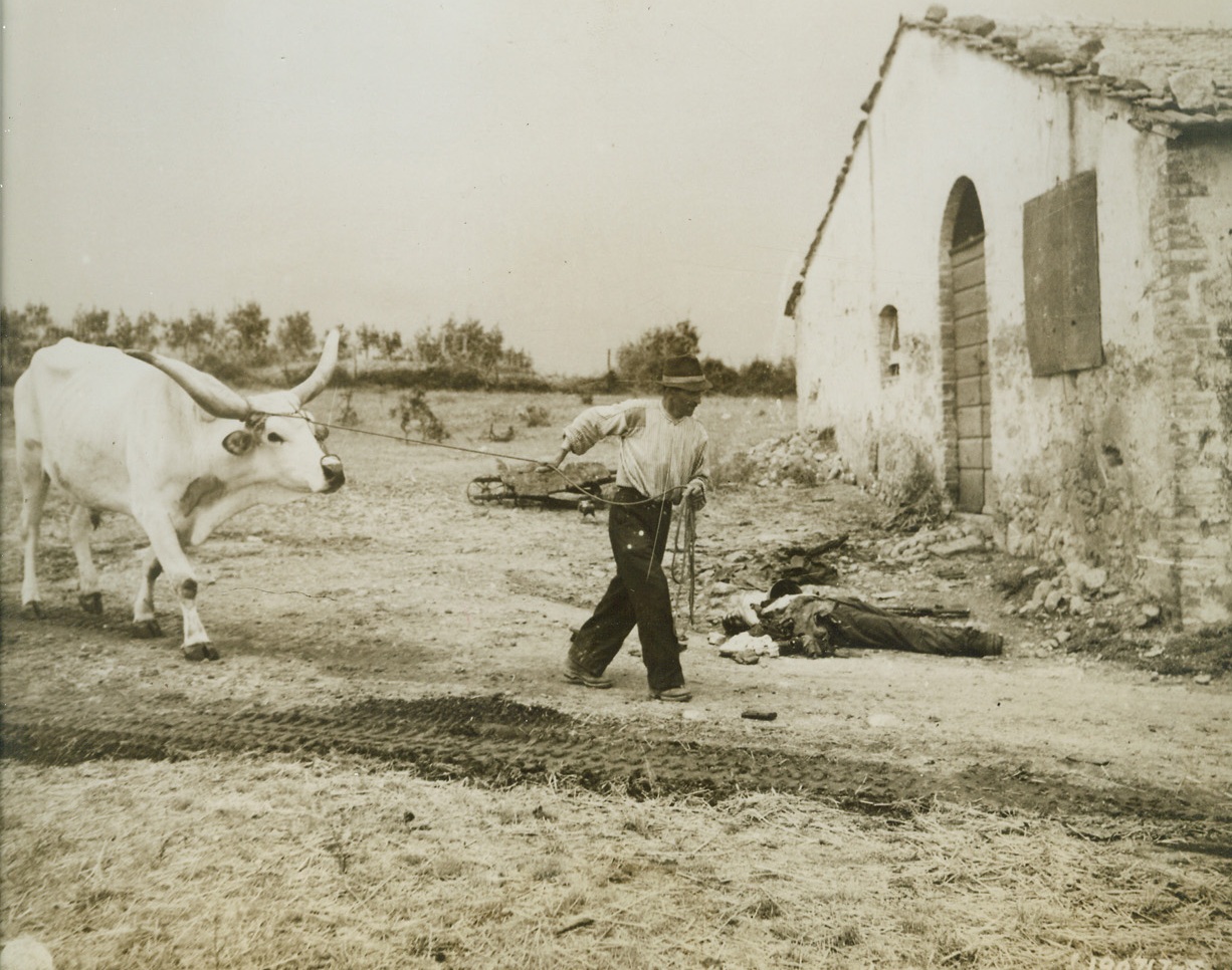 Hardened to War, 7/3/1944. GROSSETO, ITALY—War or no war, the domestic duties must go on, and this Italian Framer, calloused after living so long in the midst of battle, calmly leads his ox past a dead German lying on the ground near his farmhouse. Tank tracks in the foreground indicate that his homestead was probably a battle area not so long ago. Credit: ACME.;