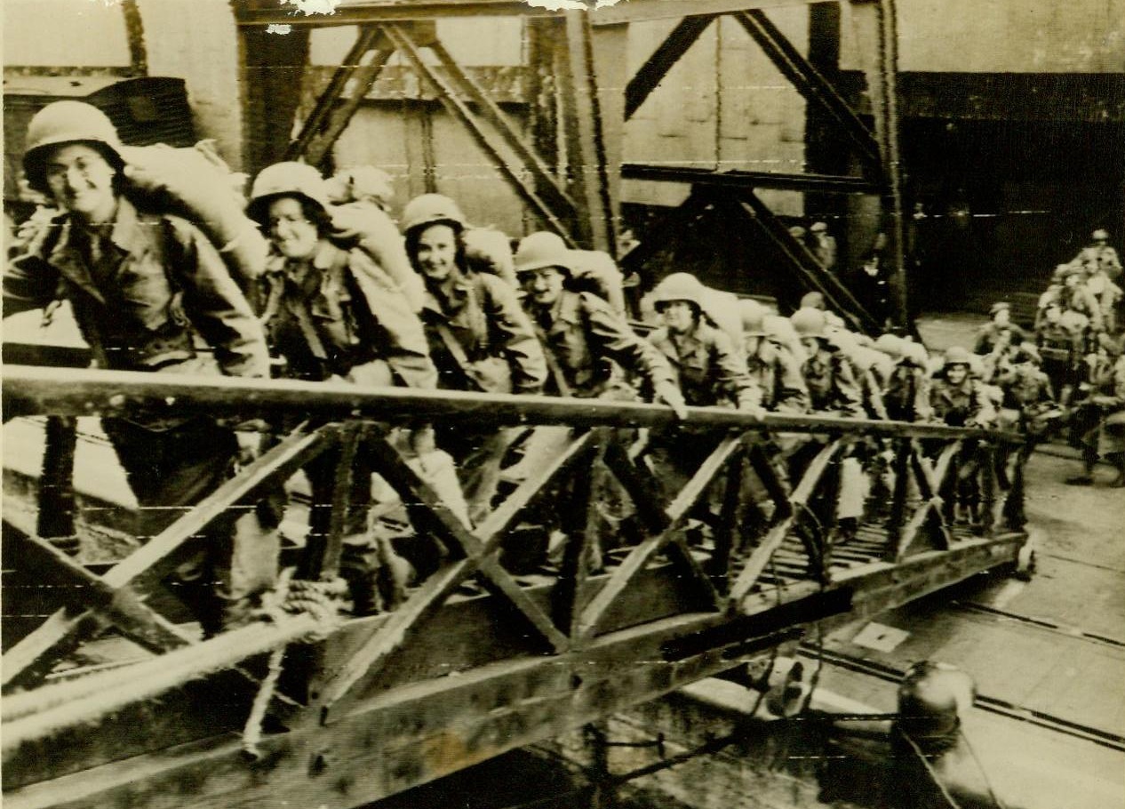WACS ARRIVE IN FRANCE, 7/18/1944. FRANCE—Grinning G.I.’s willingly assist some of the first US WACS to land in France. Note the soldier on the left still clutching mail in his hand. Credit (US Army Radiotelephoto from ACME);