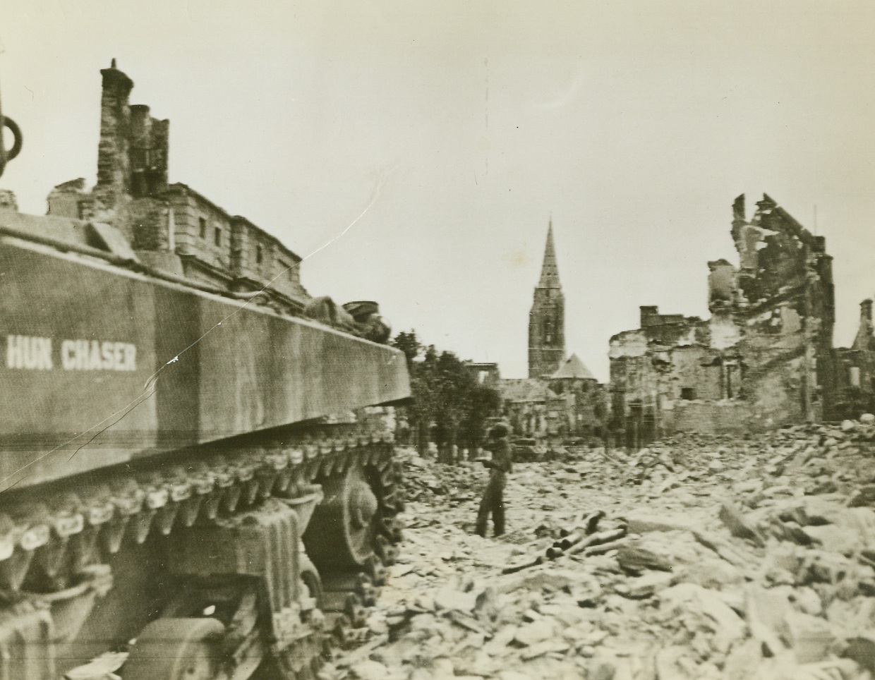“Hun Chaser” on the March, 7/21/1944. St. Lo, France – While the gigantic “Hun Chaser” tank rumbles through the debris of St. Lo, Pvt. Walter Hatfield, Princeton, Idaho, looks for snipers with field glasses and poised pistol. Blockbusters have not yet cleared the streets of rubble. Credit: US Army Radiotelephoto from ACME;