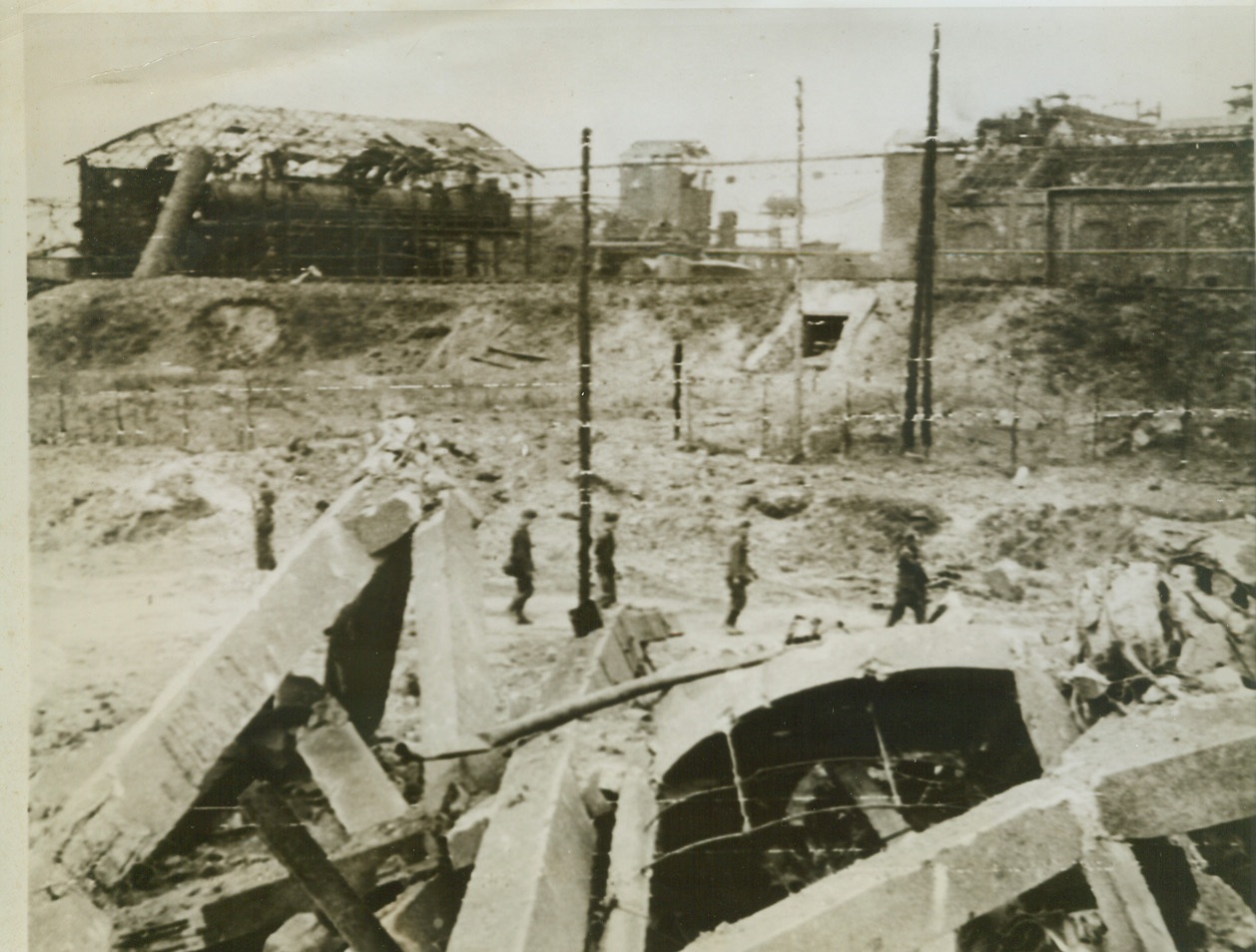Result Of Allied Bombing, 7/28/1944. France — Terrific Allied artillery and aerial bombardment preceded the advance by British and Canadian forces past the important city of Caen. The Caen canal to Fauborg remains a mass of twisted steel and rubble after Allied bombers had blasted the area. 7/28/44 (ACME);