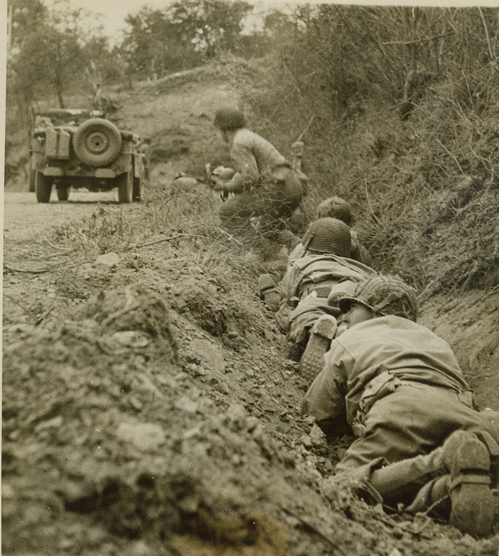 Yanks in a Spot – 3, 7/14/1944. Nemi Valley, Italy – Once the peaceful site of fragrant vineyards and the center of a flourishing wine-grape business, beautiful Nemi Valley, near Rome, was turned into a hot spot recently when a scouting patrol of Yank Infantrymen, guided by Italian partisans, found German strength much greater than they had suspected. Our boys had to fight their way out through holes in a wall of enemy machine gun fire. Here, dashing into cover provided by the bushes at upper left, the Yank shown running in ACME photo # Yan 730150 is safe. His buddies keep their guns barking as they wait for the next member of the patrol to make his break. Credit: Yank Magazine photo from ACME;