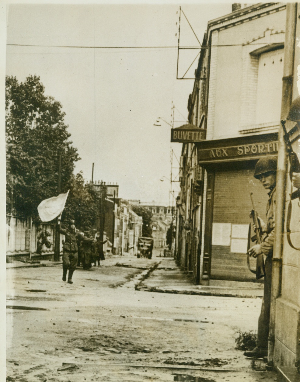 Nazis Show Their Colors, 7/1/1944. France—Defenders of a pillbox guarding a street in Cherbourg, German soldiers surrender, waving a white flag, after being knocked out of their position by Allied tank fire. Soldiers in doorway of building at right keep guns on the ready on the look out for any escape moves. Nazis carry their own wounded as they move dejectedly in defeat with their destination prison compounds. Credit: ACME;