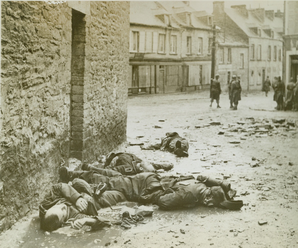 Cherbourg Defense Ends in Death, 7/1/1944. Cherbourg, France—Lying in a pool of muddy water, these Germans died as they tried to defend Cherbourg against the terrific onslaught of American forces. Their death was to no avail, for Cherbourg fell in inglorious surrender. Credit: ACME photo by Bert Brandt, war pool correspondent;