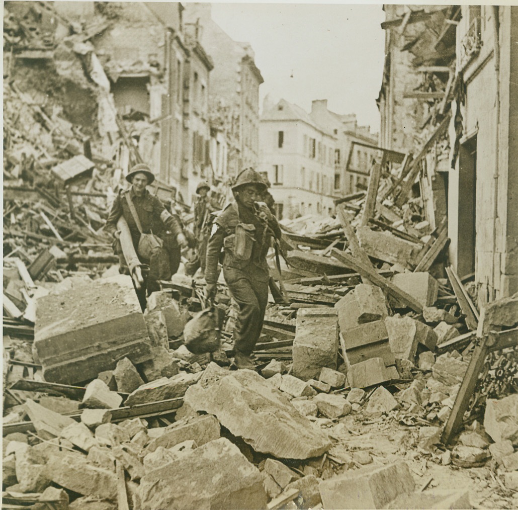 Shambles At Caen, 7/11/1944. France—Its streets filled with the rubble of blasted buildings, Caen presents a desolate picture to Canadian troops entering the city after its capture last July 6th. Here, they advance in single file, their guns ready for instant use against snipers. Today, Germans counterattacked viciously in the Caen sector, temporarily slowing the Allied advance. Credit: Canadian Army photo via U.S. Army radiotelephoto by ACME;