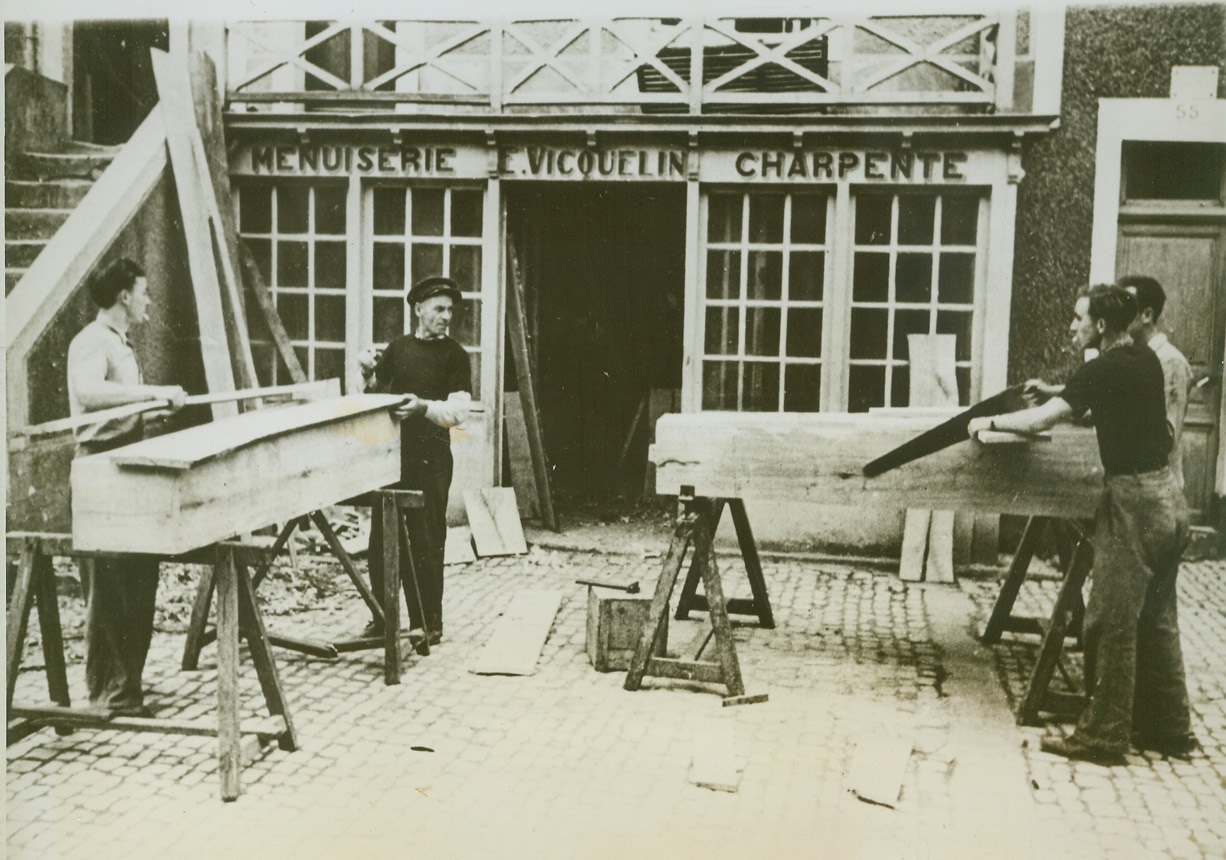 Coffins in Wholesale Lots, 7/4/1944. Grand Camp, France—Carpenters saw away at rude coffins for French civilians who were killed during the fierce fighting which followed the Allied invasion of France. So large was the number of civilian deaths that this woodmaker has enlisted the aid of three helpers to build the number of coffins needed. Credit: ACME;